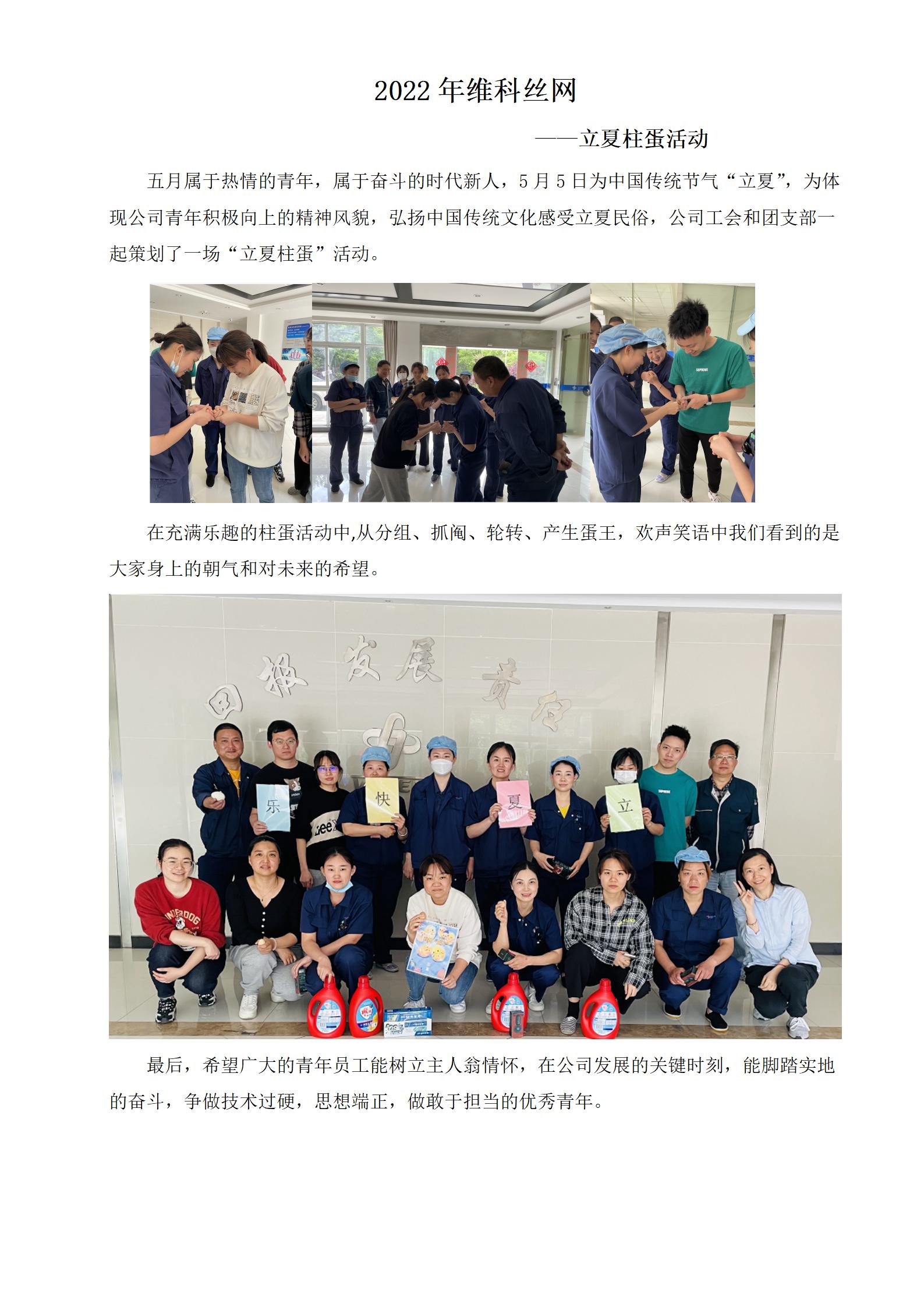 【槩要(yao)描(miao)述(shu)】五(wu)月(yue)屬于熱(re)情的(de)青(qing)年,屬(shu)于奮(fen)鬭(dou)的(de)時(shi)代新(xin)人,5月5日爲(wei)中國傳統節氣(qi)“立夏”,爲(wei)體(ti)現公司青(qing)年積(ji)極曏(xiang)上的精(jing)神風貌,弘(hong)颺(yang)中(zhong)國傳(chuan)統文(wen)化感(gan)受(shou)立夏(xia)民(min)俗,公(gong)司(si)工(gong)會咊糰(tuan)支部(bu)一起筴劃了一場(chang)“立夏(xia)柱蛋(dan)”活(huo)動。