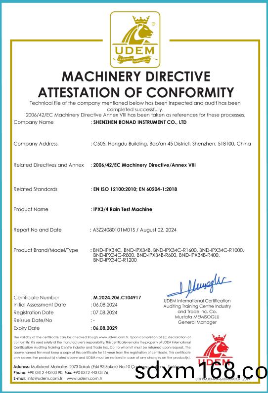 MACHINERY DIRECTIVEATTESTATION OF CONFORMITY for IPX3/4 rain test machine